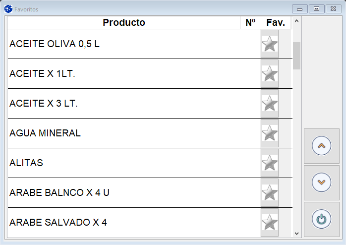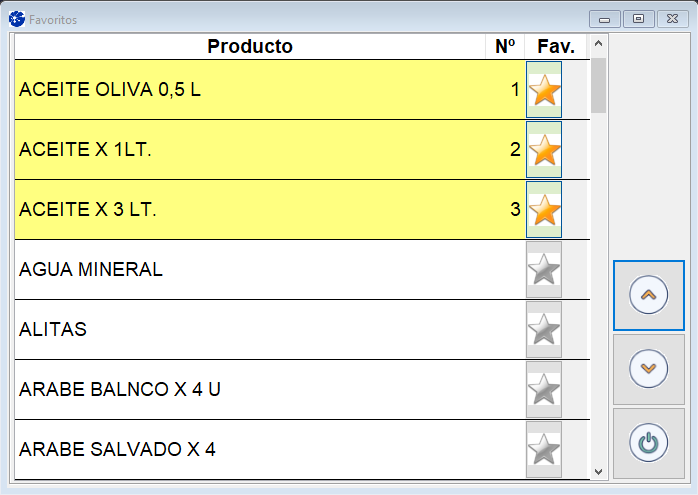 Para asignar un artículo al Grupo "Favoritos", haga clic en el ícono de la estrella que figura a la derecha del artículo elegido. Debajo a la derecha puede elegir el orden que tendrá el Artículo en el Panel de Ventas utilizando las flechas verdes.