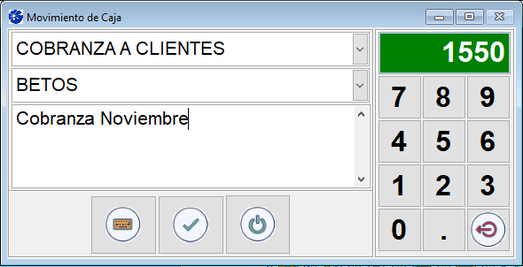 Al ingresar se observa la siguiente pantalla, seleccione en tipo de movimiento: "Cobranza a clientes" y debajo indique el nombre del cliente con el que realizó la operación. Tiene la opción de redactar un comentario sobre la operación realizada. Para finalizar coloque el importe y haga clic en el tilde verde para confirmar.