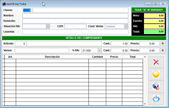 Para emitir una factura haga clic en el Menú “Fiscal” y luego en la opción “Emitir Factura”, o desde el acceso rápido: