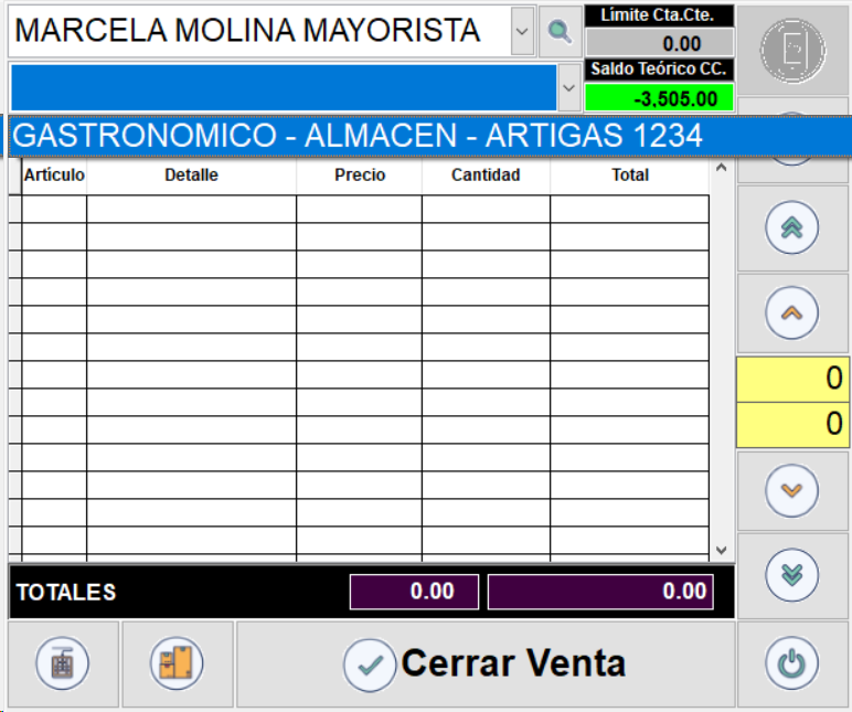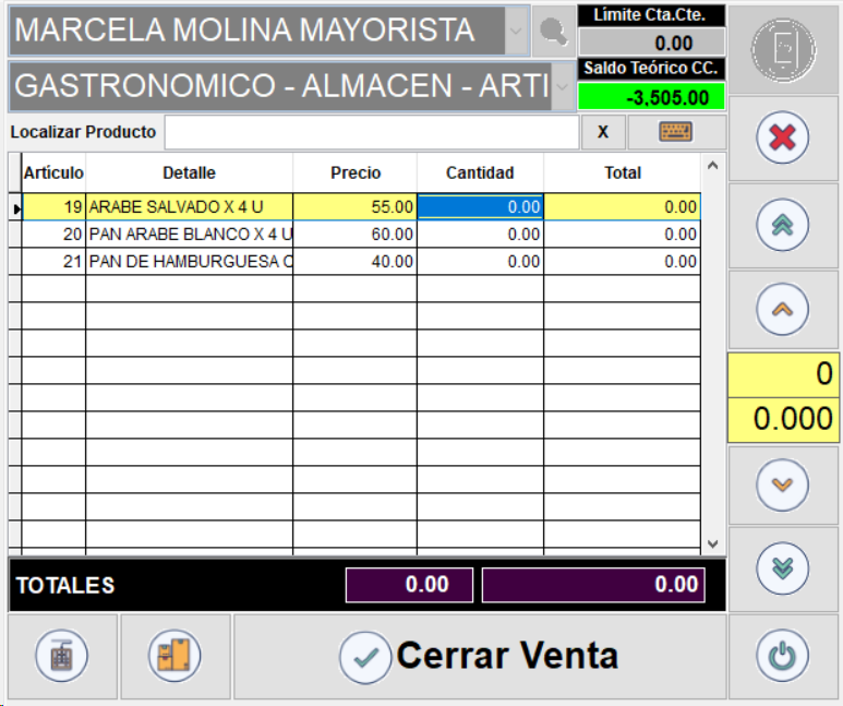 Dentro del listado de artículos, en la columna “Cantidad”, ingrese la cantidad de artículos solicitados por el cliente. Con las flechas verdes puede aumentar o disminuir las cantidades. Con las flechas celestes puede desplazarse hacia arriba o hacia abajo dentro del listado de artículos.