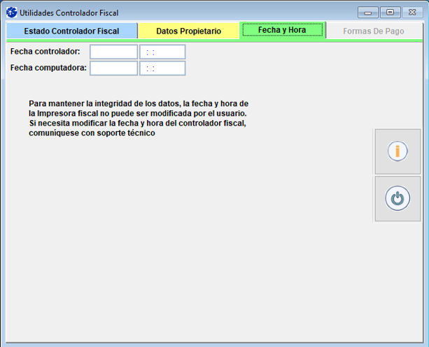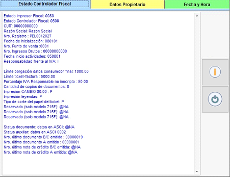 Se mostrará la siguiente ventana con la información configurada de su impresora, tales como Estado del Controlador Fiscal, Datos Propietario, Fecha y Hora.