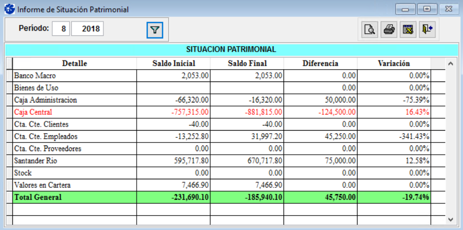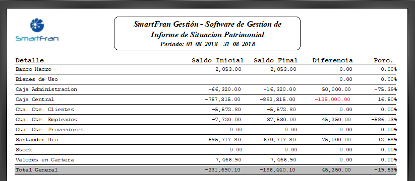 El informe muestra el estado del patrimonio de la empresa en un periodo determinado. Indica el saldo inicial y final de por ejemplo, bienes de uso, caja central, cuentas corrientes, stock, valores en cartera, entre otros.
