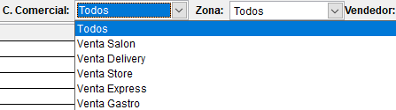 Permite filtrar las ventas por canal comercial, entre venta salón, venta Delivery, venta Store, venta Express y venta gastronómica.