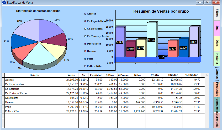 En la esquina superior izquierda, muestra un recuadro con la correlación de colores, indicando a qué grupo pertenece cada color. Y en la parte inferior muestra una tabla con el detalle de los artículos por grupo, el importe y el porcentaje que representan las ventas, la cantidad de las mismas, el importe de los descuentos y de las promociones, la cantidad de kilos vendidos, el costo de los artículos, la utilidad y porcentaje del mismo.