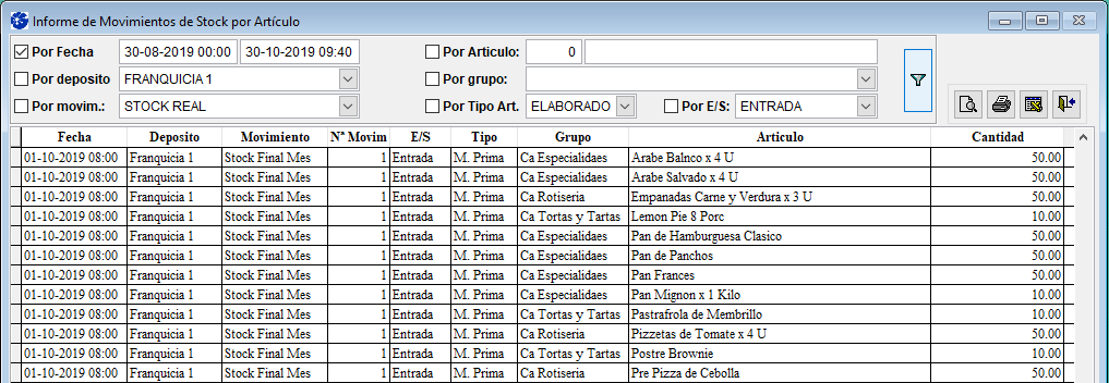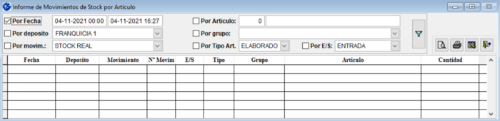 Por último, presione el botón del embudo (filtro)  para visualizar los diferentes artículos y el resumen de Movimientos de Stock realizados, según los filtros indicados.