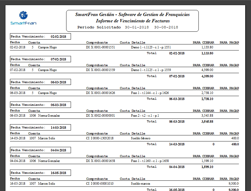 A modo de ejemplo, coloque la fecha en "Desde F. Vto" desde 30/01/2018", en "Hasta F. Vto" indique 30/08/2018, y realice clic en el ícono de vista previa. Observará la siguiente información: