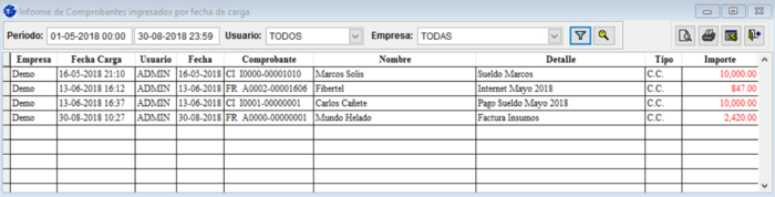 A modo de ejemplo, filtre en período filtrado las fechas desde 01-05-2018 hasta 30-08-2018, indique Usuario y Empresa "TODOS", y haga clic en el ícono "Filtrar" y observará la siguiente imagen: